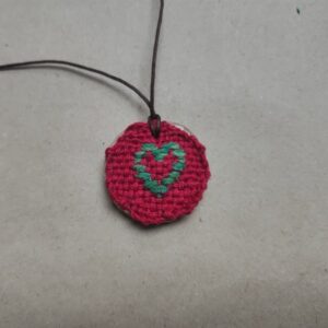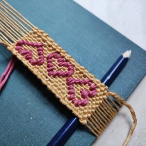 Vidonávod i fotonávod na vytkvanou kulatou brož se srdíčkem. Naučíš se tkát jakýkoliv tvar si vymyslíš. A můžeš si tak se srdíčkovým náramkem udělat sadu.
